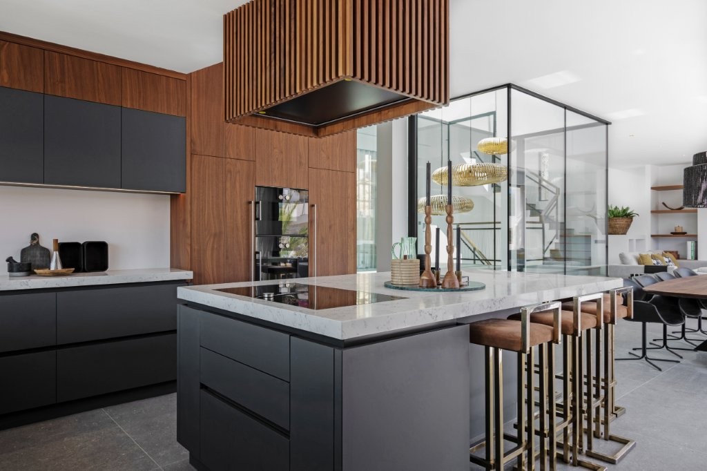 Spanning 426m2 on a generous 1404m2 plot, Can Tauet boasts 5 spacious bedrooms, each with its own luxurious ensuite bathroom, offering a warm and inviting atmosphere. The villa features an impressive open living and dining area on the main floor, flooded with natural light through large floor-to-ceiling windows that overlook the lush surroundings. The modern, fully-equipped kitchen with a sophisticated bar seamlessly connects indoor and outdoor living, making it perfect for entertaining friends or savoring a morning coffee.