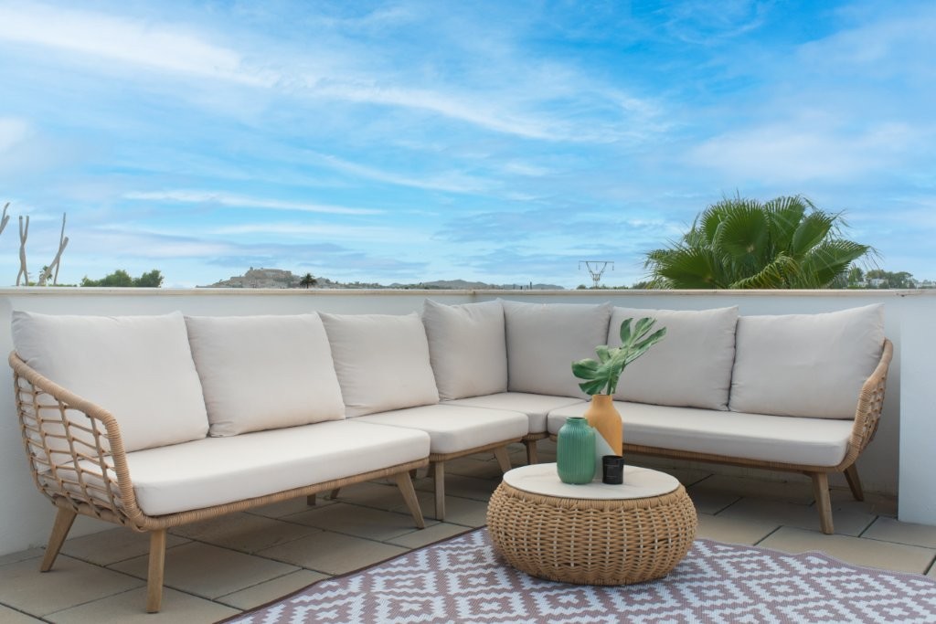 The outdoor area surrounding the private pool is designed for relaxation and summer enjoyment. Lounge on the sunbeds, dine al fresco, or host intimate gatherings with loved ones by the barbecue. The pièce de résistance of this property is the spacious rooftop terrace, offering panoramic views of the surroundings and the iconic silhouette of Dalt Vila in the distance - a magical setting for captivating sunsets. The rooftop terrace also boasts an outdoor shower, providing a refreshing way to cool off on warm summer days or after a morning yoga session under the blue skies. Townhouse Jesus epitomizes a move-in-ready living experience where indoor and outdoor spaces harmoniously blend, creating an ideal home for those in search of comfort, ambiance, and the quintessential Ibiza lifestyle all year round.