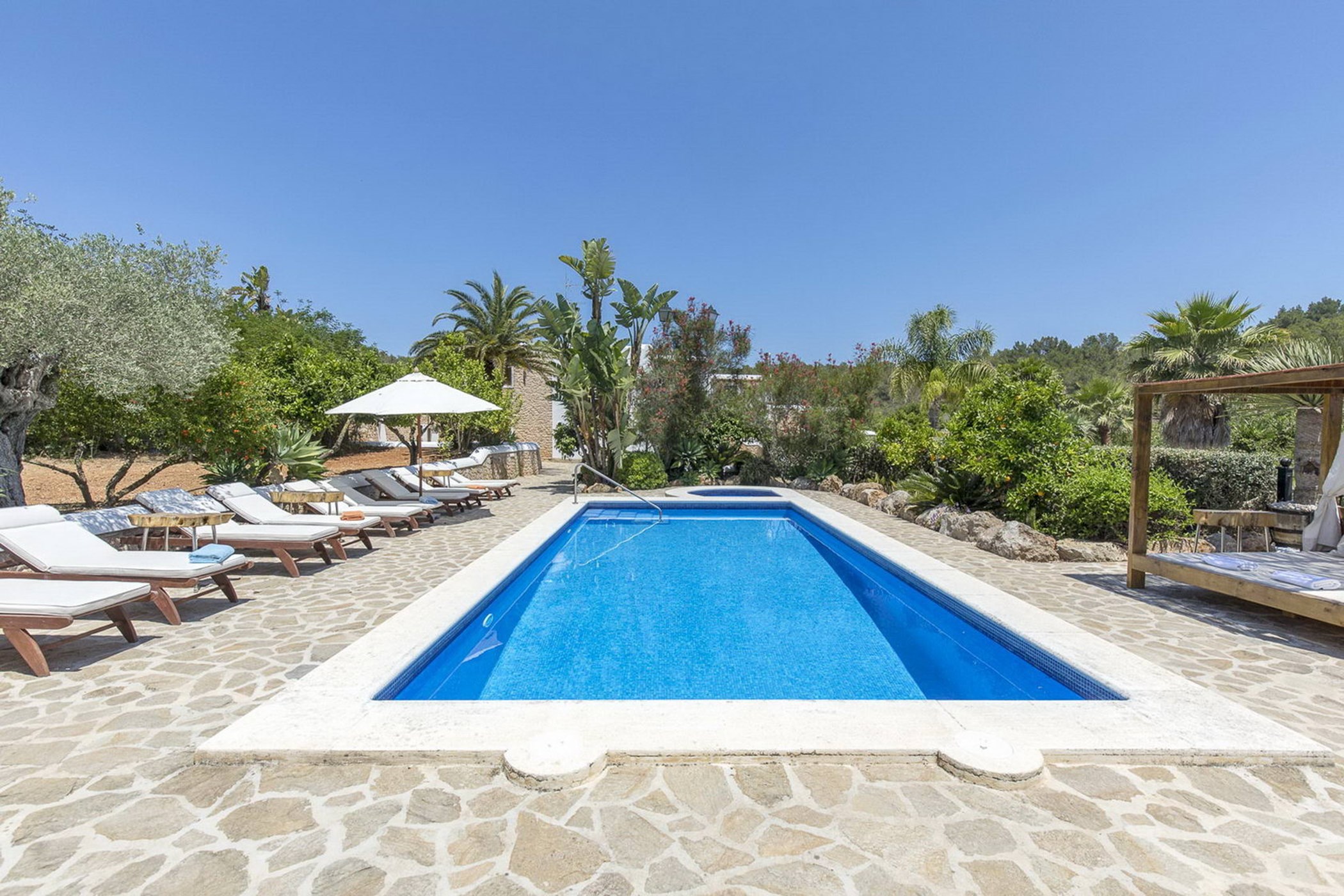 Immerse yourself in the tranquil ambiance of this lovingly updated property, surrounded by mature trees and fragrant flowers in the beautiful gardens. Enjoy the perfect space to unwind and bask in the Ibiza sunshine, with the large pool surrounded by tropical greenery, sun loungers, and a freestanding hammock. Relax by the pool with the soothing sounds of nature or your favorite music on the poolside sound system. The gardens also boast a Bali-inspired chill-out pavilion with a dining area, daybed, sofa seating, and a swing bench, creating a tranquil outdoor retreat.