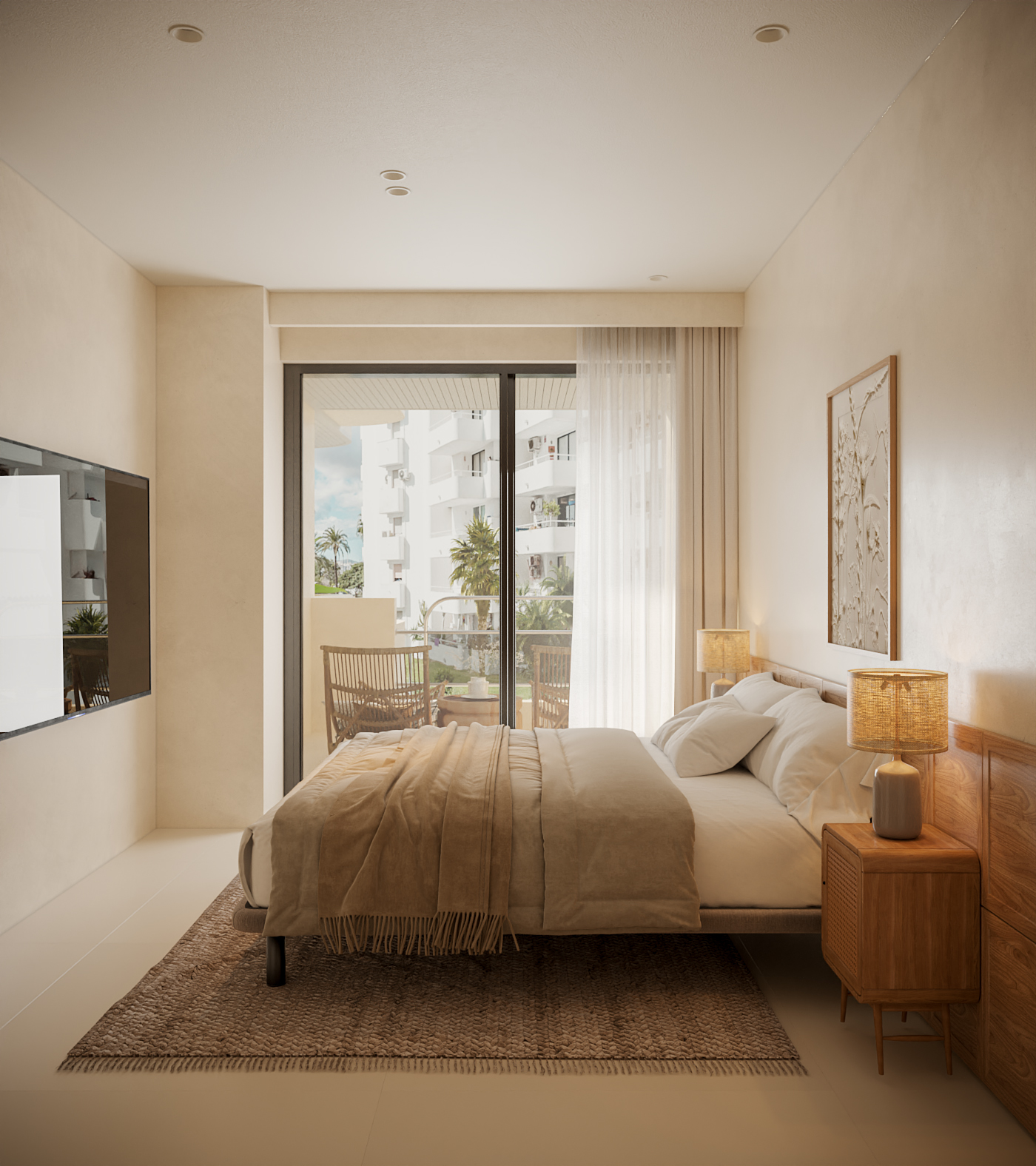 Apartament 308 includes two bedrooms designed with a minimalist yet cozy approach. The master bedroom boasts a generous double bed and refined finishes, reflecting the overall serene character of the apartment. Both bathrooms are fitted with smooth microcement surfaces and large walk-in showers, showcasing a clean and modern aesthetic that's easy to maintain.