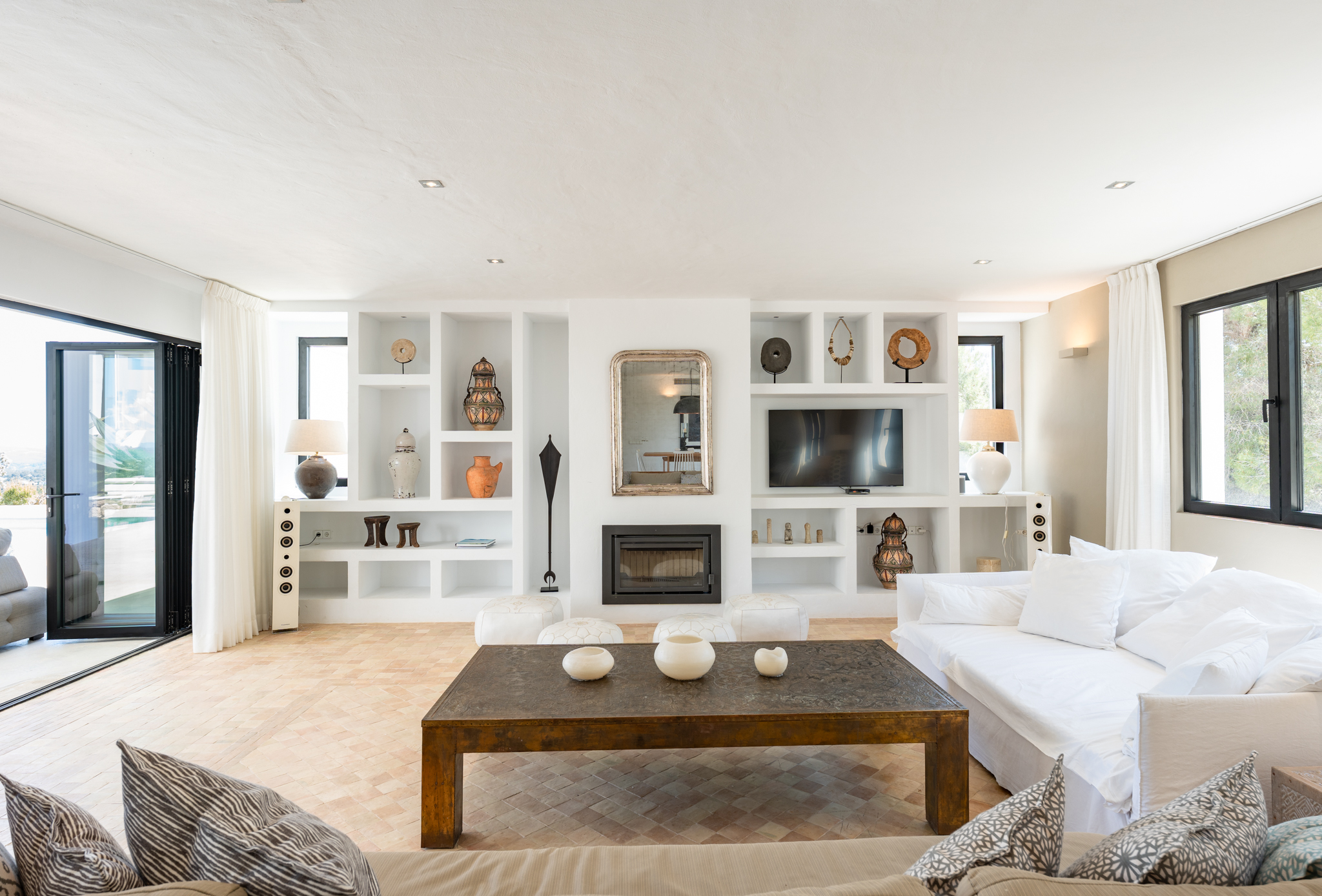 The villa features a bright living room with a cozy fireplace that seamlessly flows into the expansive terrace, offering the perfect setting to prepare meals in the outdoor kitchen and barbecue while witnessing the sky painted in shades of orange by the setting sun.